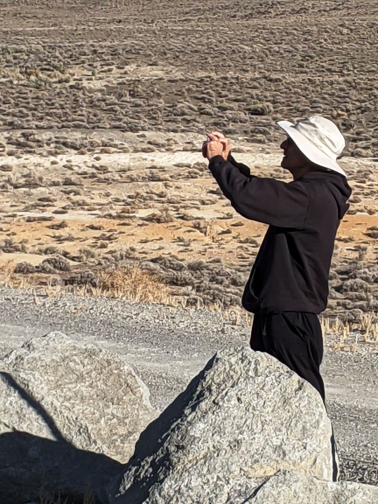 We turned around a mile or so down the road and came back to the tower, assuming we would easily find it not far from where we parked. However, we looked and looked, walked both sides of the steep banked elevated road, but somehow it disappeared. During our meandering back and forth and up and down, Bobby pulls up alongside and says “how do”. This blew our mind because Bob had texted us he was at the summit as we were at the highway 20 intersection, a good 20-30 minutes ahead of us. It turns out he stopped to visit the Pyramid Lake Museum in Nixon. He joined the search party, but somehow this plastic water bottle stumped us all and was not to be found. Eventually we gave up and headed on down the road to Gerlach.