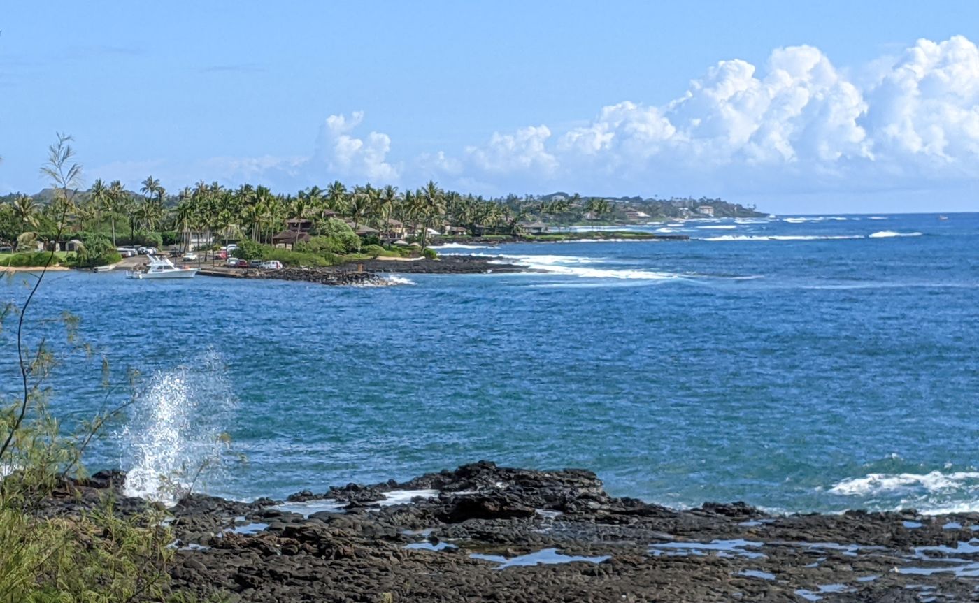 The next morning I took a huge walk down the beach again, past Marriott’s and a few other ocean-front resorts, weaving in and out of the beach accesses and the paths through the resorts.  I passed RumFire waterfront restaurant that I passed along to Rick and he ended up taking Jo there for a dinner.  I got back out to the street and followed a great walking path making time down Hoonani Road to Koloa Landing.   The rest of the day was spent watching the kids take surfing lessons and scuba diving.