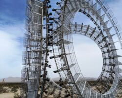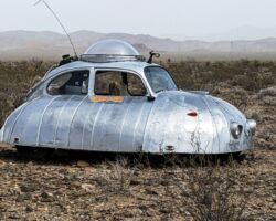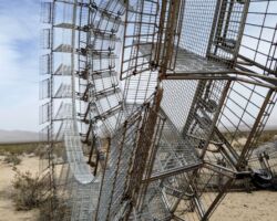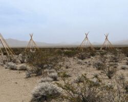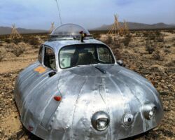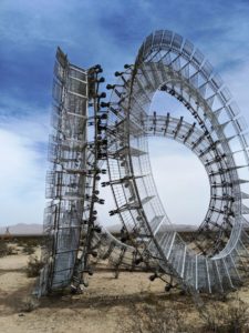 There was a giant bright silver shiny three wheeled thing that looked like 3 electric razor heads on end, maybe 30 feet tall. Up close, we saw that they were shopping carts on their sides made into these 3 giant wheels. There was a spaceship car, a giant flying stingray, and the frames of half a dozen teepees. As Bob, Tom, and I wandered about taking pictures, Bob was drawn away by the presence of a guy in a golf cart. After a brief discussion, Bob came over to tell us we were trespassing and had to go. The guys wasn’t too pleased that we had driven in across the chain, but he knew we were harmless and the only other living humans around these parts.