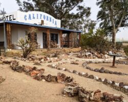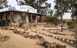 It soon became apparent that we were late for the boom history of Nipton. The store was closed; the bar was closed; the hotel was closed; the campground may have been open but we couldn’t tell. We pulled into a parking area that seemed to be attached to something, but we couldn’t tell what. A tiny “No Trespassing” sign at ground level alongside a chain that was laying on the ground didn’t provide much deterrent; not give a strong impression that they really wanted to keep people out. Besides, before us lay a very strange collection of “art” or desert strangeness not uncommon in these parts.