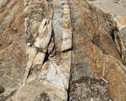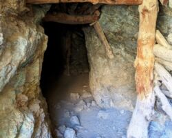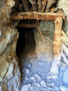 The road eventually became more of a narrow wagon trail. It clearly had been made for the mine, and perhaps even went up and over the ridge to the North, past the mine as more of a through road rather than just access to the mine. I was getting to the end of my hiking interest when Bob identified the little side trail up to the actual mine. Below the lip of the mine was covered in green shale-like rock and some of the wooden beams of the shoot and the massive bolts holding them together were still present. We poked around a bit and then retired in the shade for a celebratory beverage.