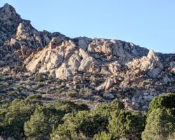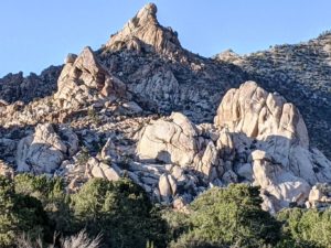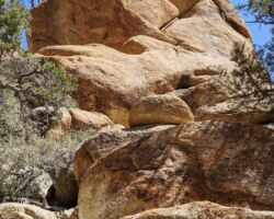 We got some grub and a beverage and sat in the shade reliving our hike. We dozed, and futzed with gear, and washed up, and nodded off, and read a bit. Eventually, it was grub time and Bob fixed up one of his tostada meals with all the fixins. It was wonderful. We had a nice little fire after the breeze died down even more. A gummy or 2 was distributed to ease the aches and pains and they must have invigorated the boys as we headed out of camp for a stroll up to the massive rocks that sort of marked the spot where the broad open savanna-like valley ended and the road dropped down into the thick Pinyon Pine forest we were camped in.
