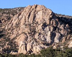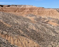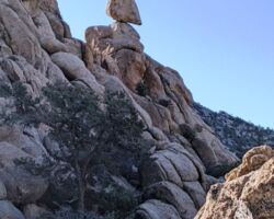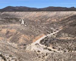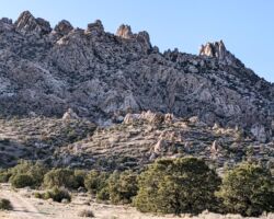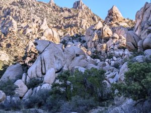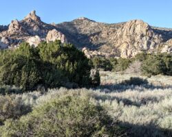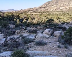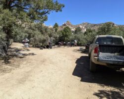 Bob pointed out the road he and Marya had camped on last Spring, and we eventually turned off on the last spur where Tom and Bill and I had driven with Jordan and David on our last trip to Mojave. When we got out of the rigs, we were met with the wind we had been expecting. This was the farthest up the canyon I had been, and although we were among a grove of large Pinyon Pine, the wind was blasting, and there was scant level or clear space. The boys were not home yet. We split up and explored a couple spur roads we had passed and Tom and I went back to the main road in and then turned left to go higher up into the canyon. There didn’t appear to be much road, but as is sometimes the case, we found that it did continue. There is always more to explore.