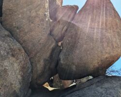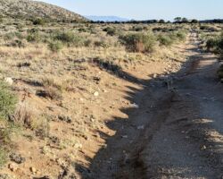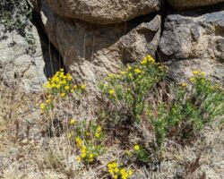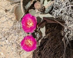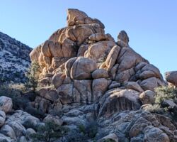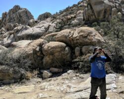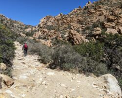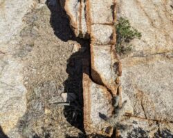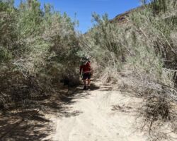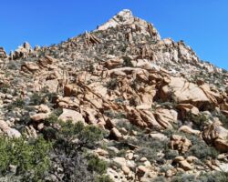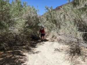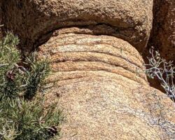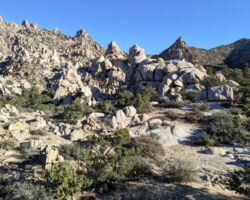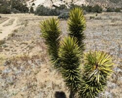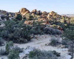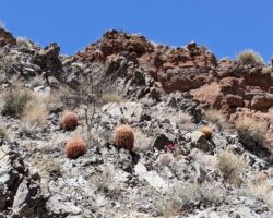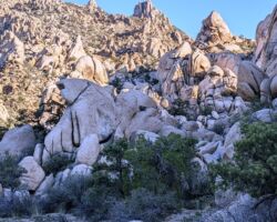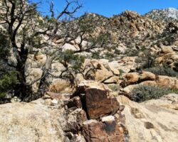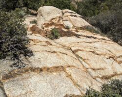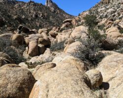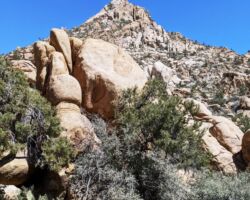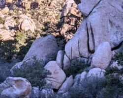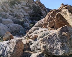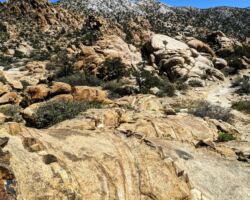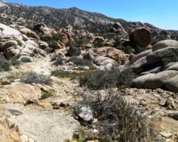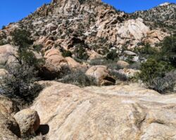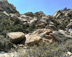 Nonetheless, prior to coming to those tracks, we came to another road without such signage so we decided to head up it and explore. It obviously had been used quite extensively as the road in was good and several spots had been trampled and cleared from use. We poked around here and there and finally settled in the shade of a massive boulder pile for some R and R. We were marveling at the great number of plant and brush species there were right in this little area, even though, at first glance, there wasn’t much growing at all. I should have pushed on and checked out those other roads as coming back is less and less likely. However, we again ran out of time and motivation and just headed back to camp.