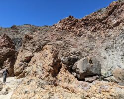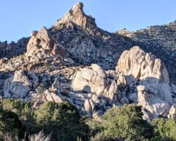 Bob and I wanted to explore up higher a little more to see if the road possibly continued on up and over the pass to the North, so we headed on up what may have been a trail, but soon petered out into perhaps seasonal creek or game trail. We picked and prodded under fallen trees and scrambled over boulders, climbing higher as we went. We stumbled into what appeared to be a rock outline for a cabin foundation or the perimeter of an old garden or sitting area. We soon found 2 areas where massive numbers of canned food and goods had been deposited. This definitely had been someone’s camp a long time ago. That was about the end of the line. If there was a path or route up and over the pass, we weren’t on it, and had been gone long enough. I had assumed Bill and Tom had headed on down from the mine ahead of us, but as we approached the first big rock face, here they sat. Reunited, we began the descent back to camp, getting another perspective on all the wonderful rock formations.