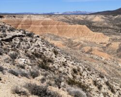 Before long, we were out there. The road in stretched was great smooth gravel where we could go 35-45 MPH. In other stretches, we were climbing or dropping 20 feet into massive boulder strewn washes or listing at 30 degrees on clay banks that may not have been easier to drive on than just heading cross country through the brush. It was a wild wild drive and really gave a scale of vastness that stretched all the way to Arkansas and Louisiana before the vegetation changed. We weaved back and forth on a number of routes that criss crossed each other and several others. We stopped a couple times to compare notes, but I think it didn’t matter which track we were on, they were all going to end on the lone North-South track that lay at the foot of the hills to the East that we had to hike through. And so it did.