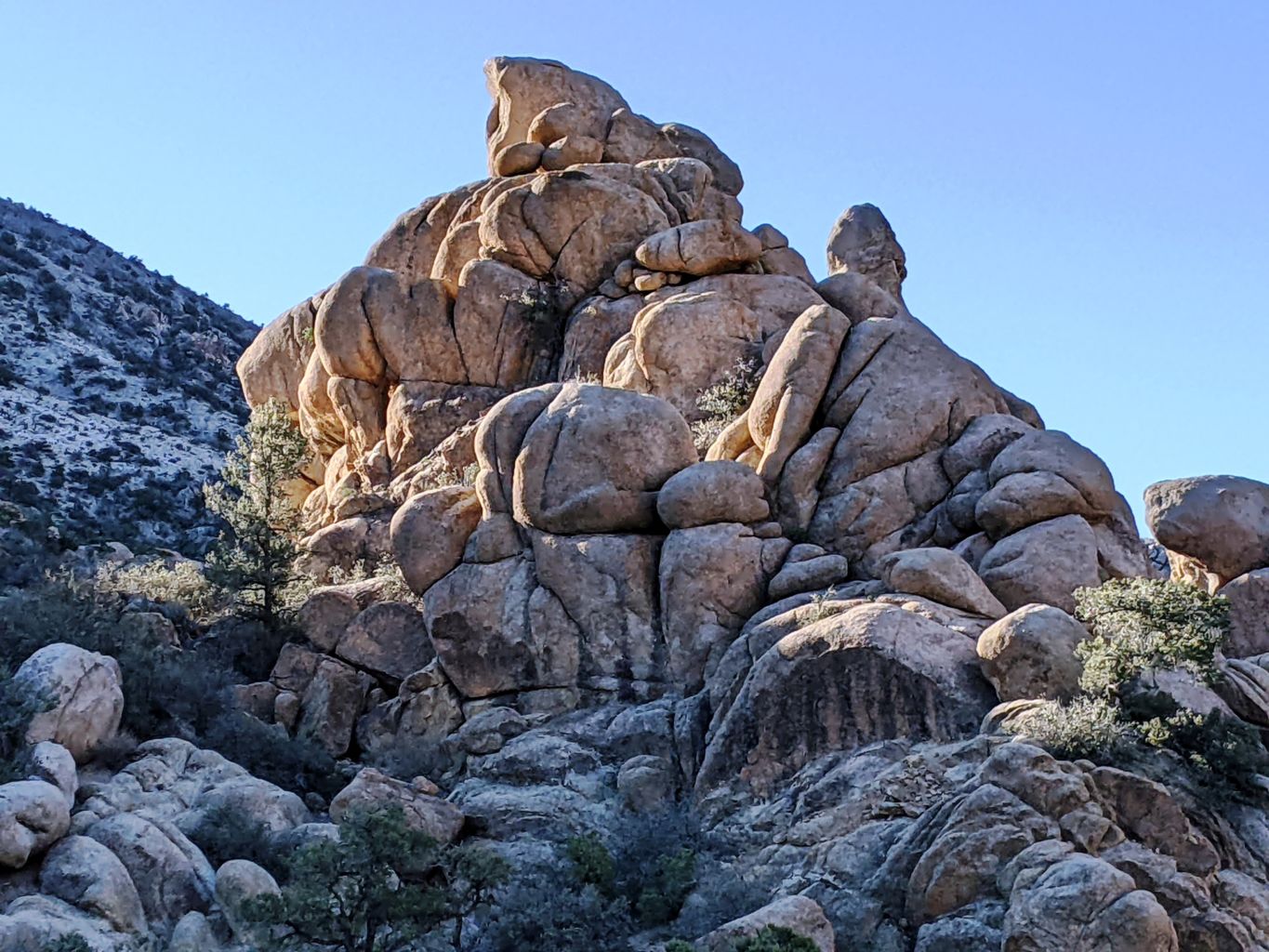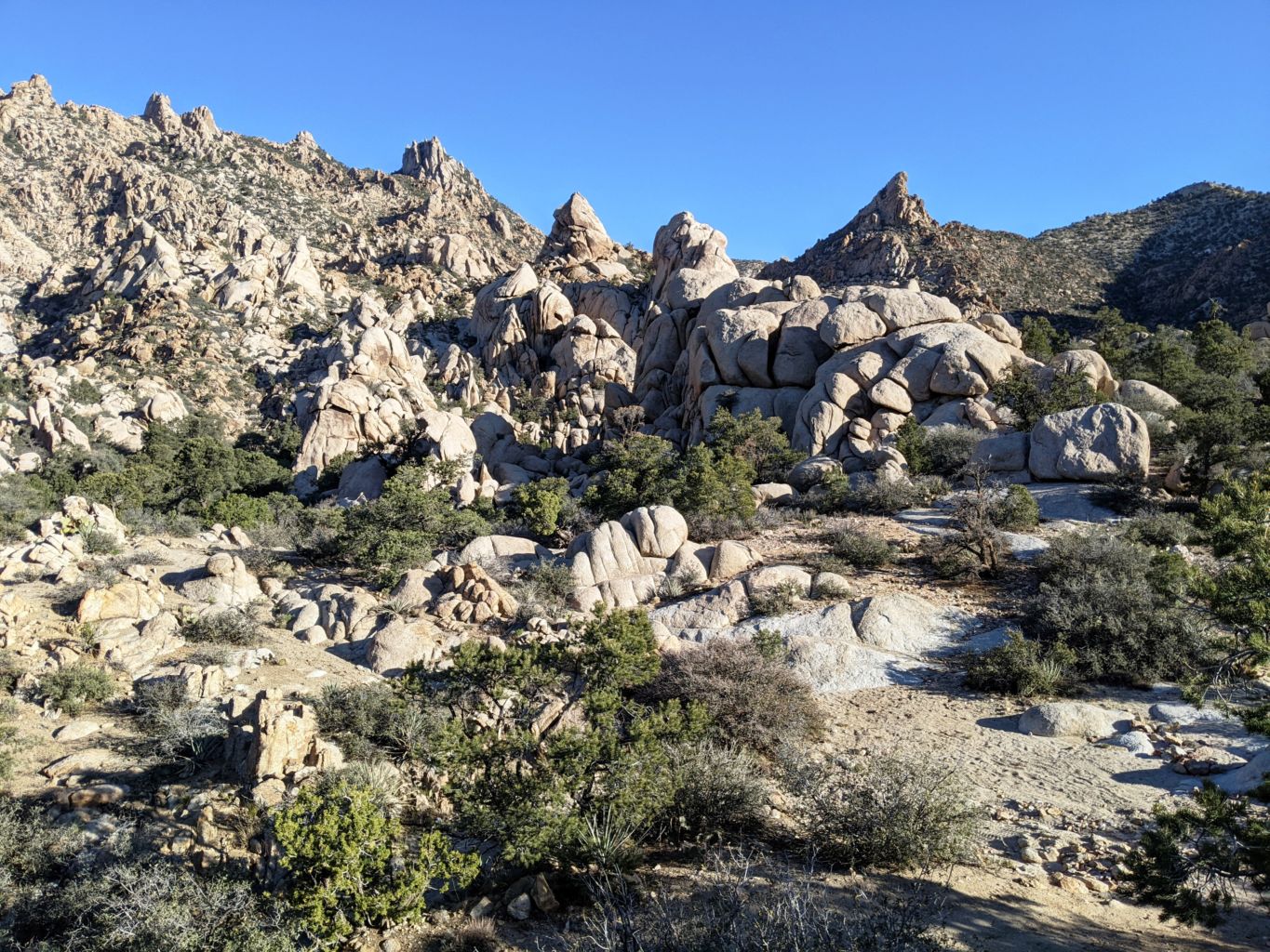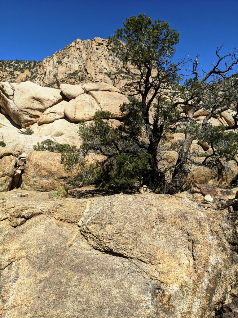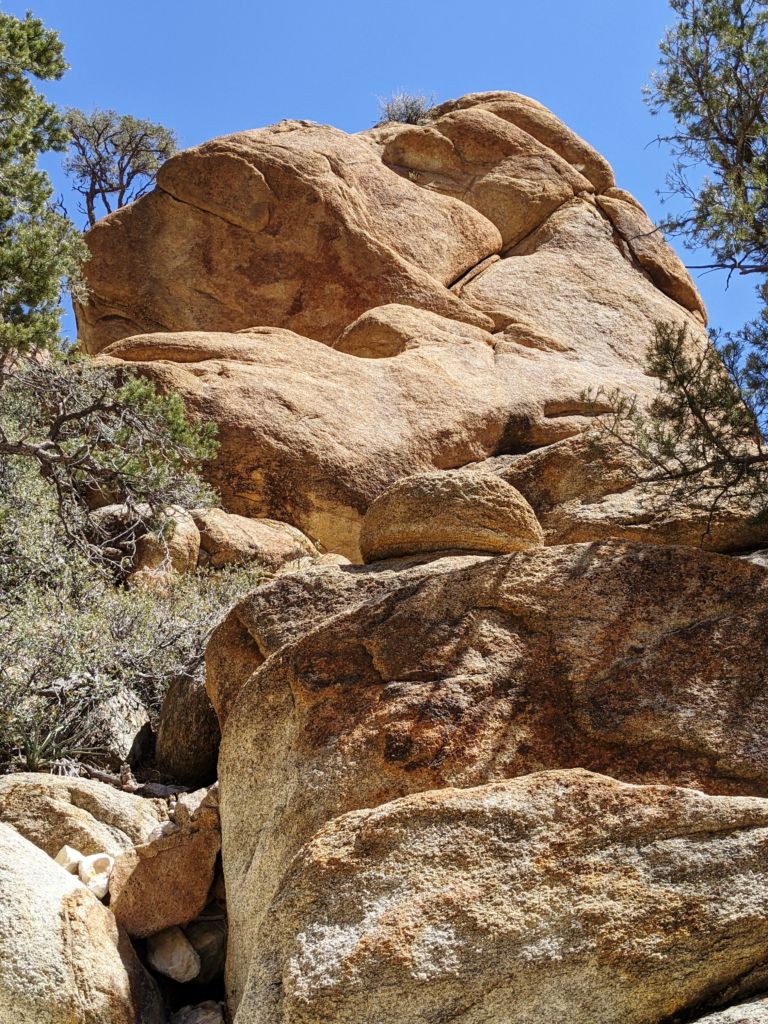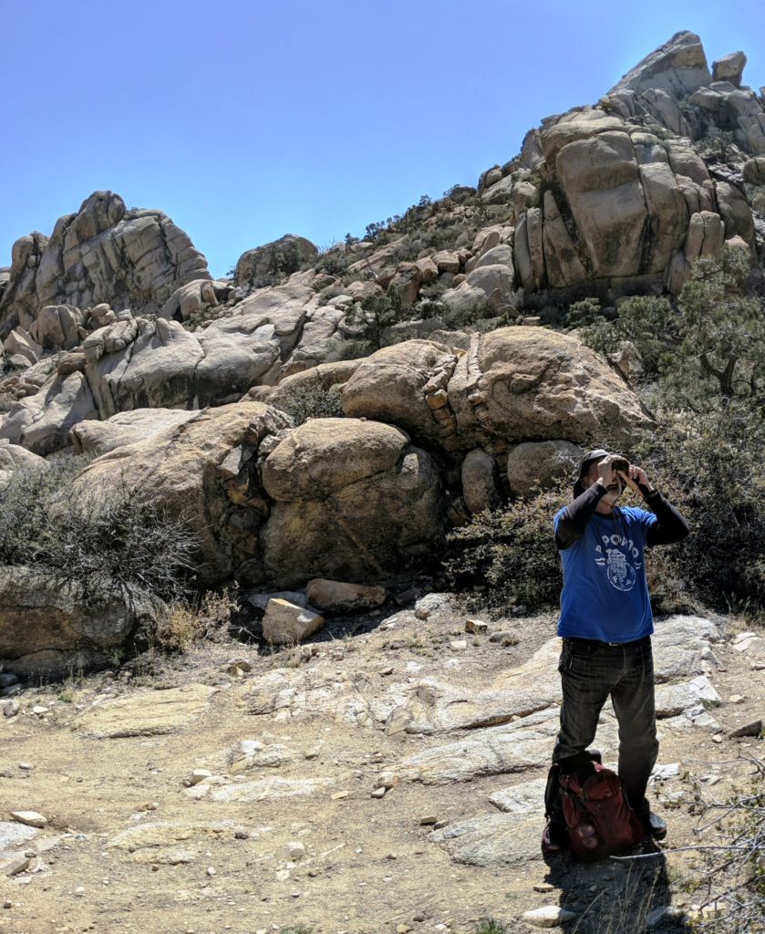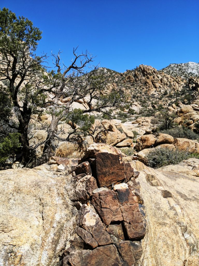 Bob pointed out the road he and Marya had camped on last Spring, and we eventually turned off on the last spur where Tom and Bill and I had driven with Jordan and David on our last trip to Mojave. When we got out of the rigs, we were met with the wind we had been expecting. This was the farthest up the canyon I had been, and although we were among a grove of large Pinyon Pine, the wind was blasting, and there was scant level or clear space. The boys were not home yet. We split up and explored a couple spur roads we had passed and Tom and I went back to the main road in and then turned left to go higher up into the canyon. There didn’t appear to be much road, but as is sometimes the case, we found that it did continue. There is always more to explore.