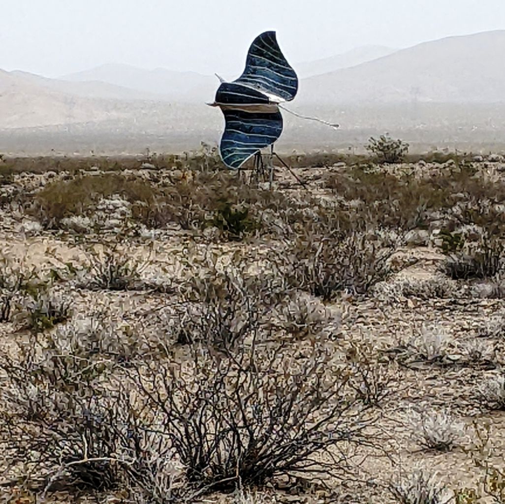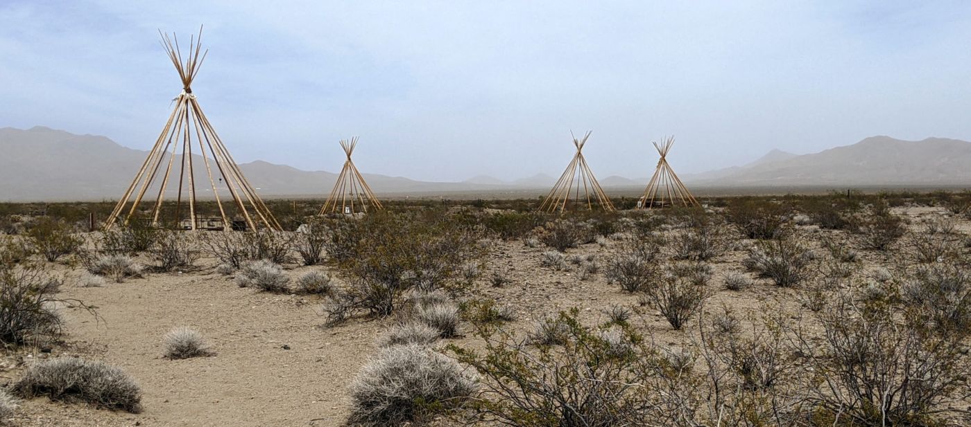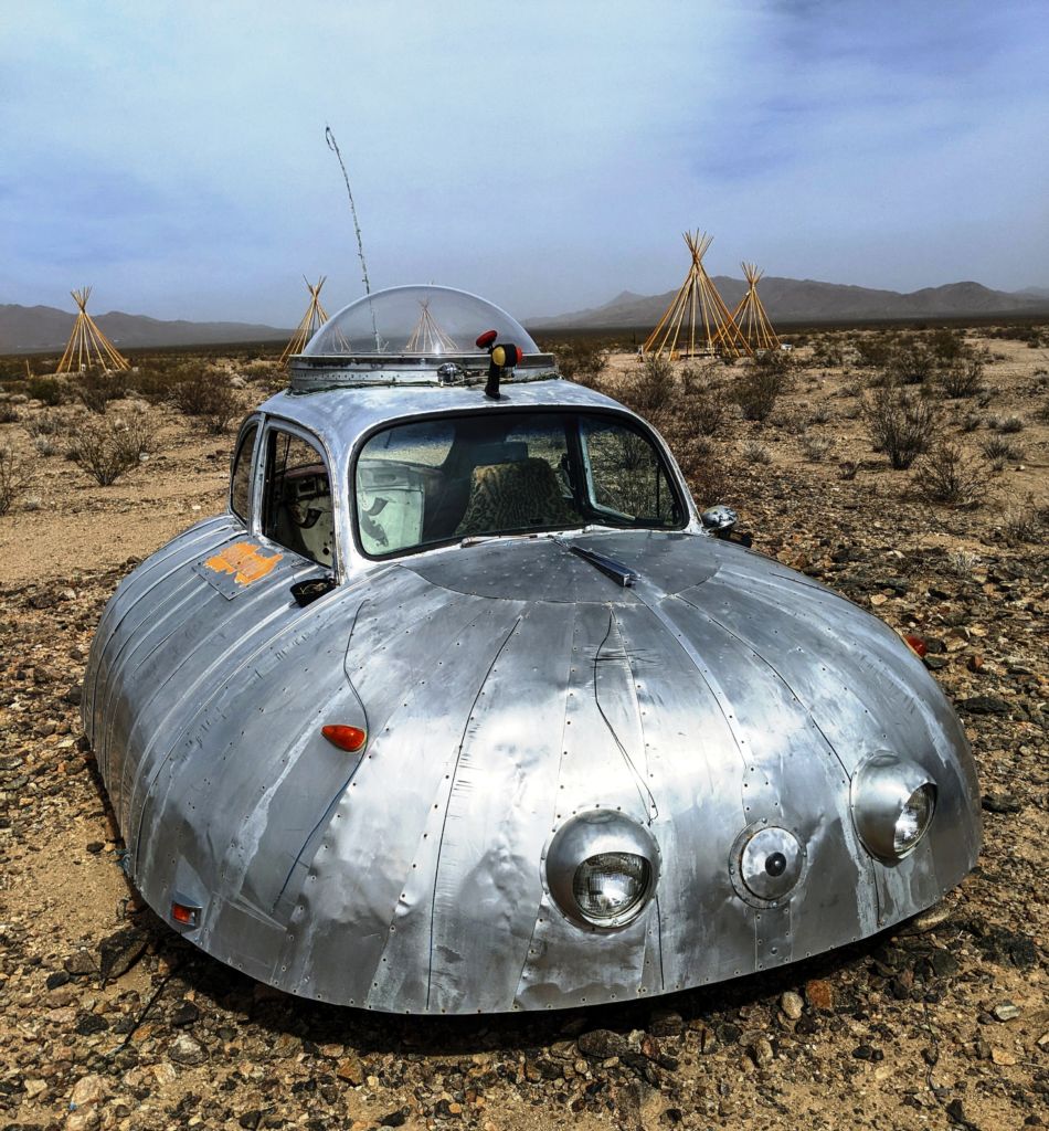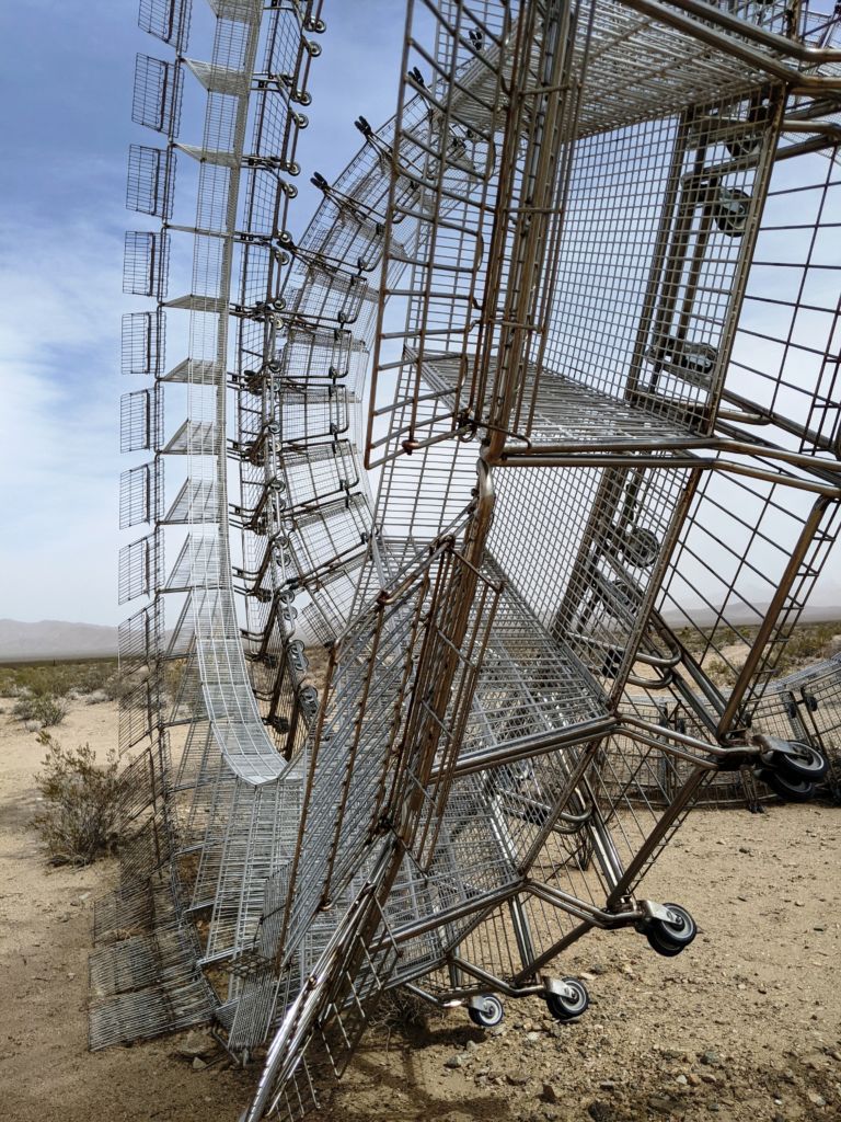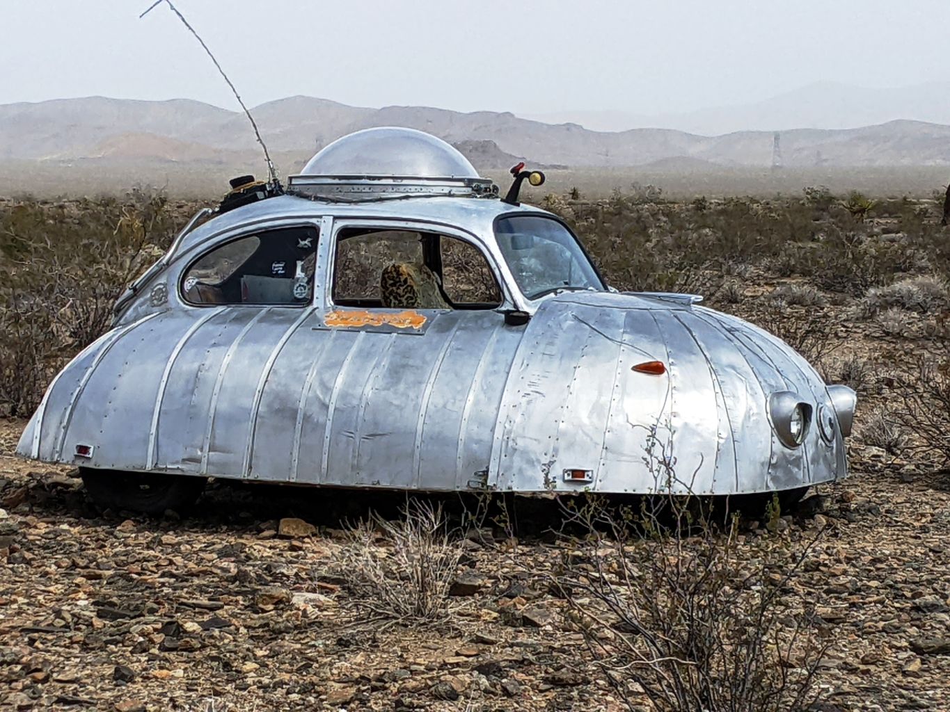 There was a giant bright silver shiny three wheeled thing that looked like 3 electric razor heads on end, maybe 30 feet tall. Up close, we saw that they were shopping carts on their sides made into these 3 giant wheels. There was a spaceship car, a giant flying stingray, and the frames of half a dozen teepees. As Bob, Tom, and I wandered about taking pictures, Bob was drawn away by the presence of a guy in a golf cart. After a brief discussion, Bob came over to tell us we were trespassing and had to go. The guys wasn’t too pleased that we had driven in across the chain, but he knew we were harmless and the only other living humans around these parts.