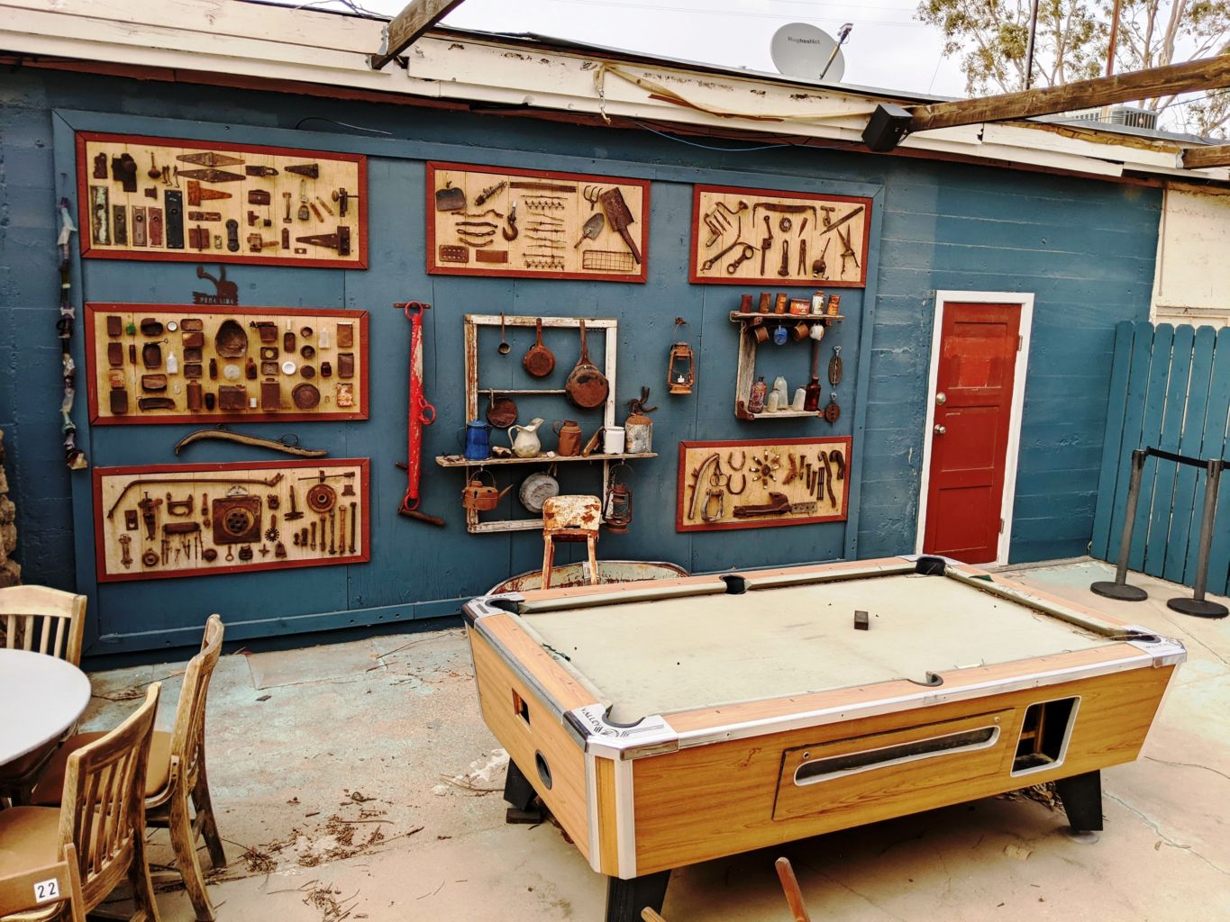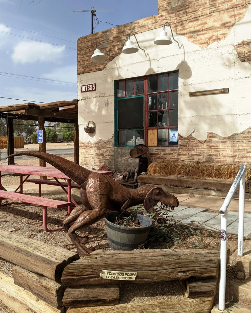 We snapped a few last pics and returned to the rigs, back across the chain and back through town. As we passed the bar/store, we also passed him talking to another old desert rat. He motioned us into the parking area in front of those buildings. This area had a nice large mesquite tree, picnic bench, some more art, and a sign talking about the brief history of Nipton. We looked around a bit to see if there might not be an open side door or secret entrance to these establishments. Still outside, I walked around to talk to these guys and see if I could scrounge up an unlocked door or access to anything in town. Maybe the secret poker game was in the abandoned trailer on the outskirts of town.