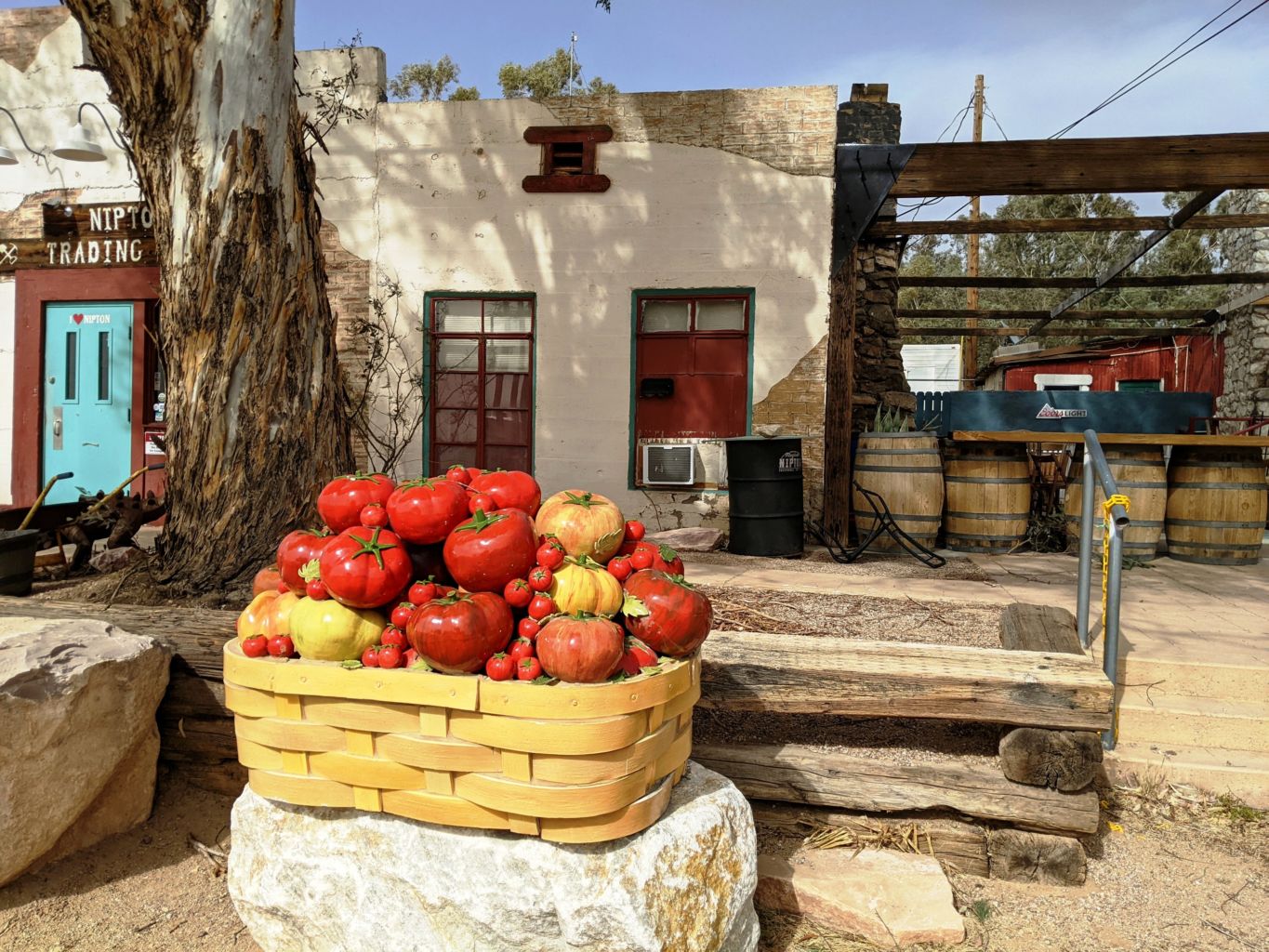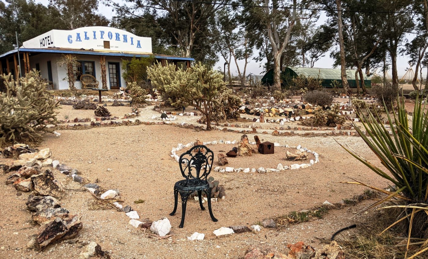 It soon became apparent that we were late for the boom history of Nipton. The store was closed; the bar was closed; the hotel was closed; the campground may have been open but we couldn’t tell. We pulled into a parking area that seemed to be attached to something, but we couldn’t tell what. A tiny “No Trespassing” sign at ground level alongside a chain that was laying on the ground didn’t provide much deterrent; not give a strong impression that they really wanted to keep people out. Besides, before us lay a very strange collection of “art” or desert strangeness not uncommon in these parts.