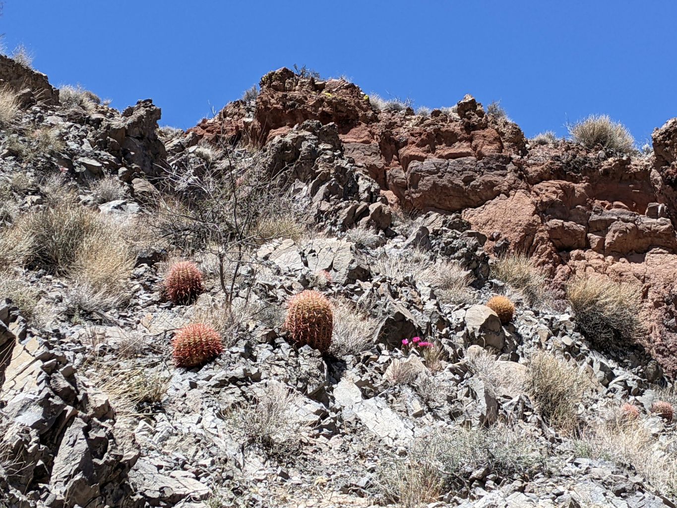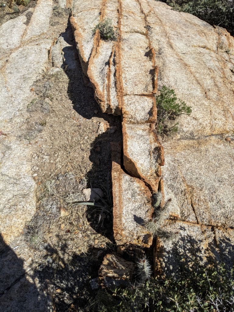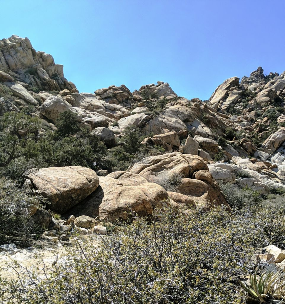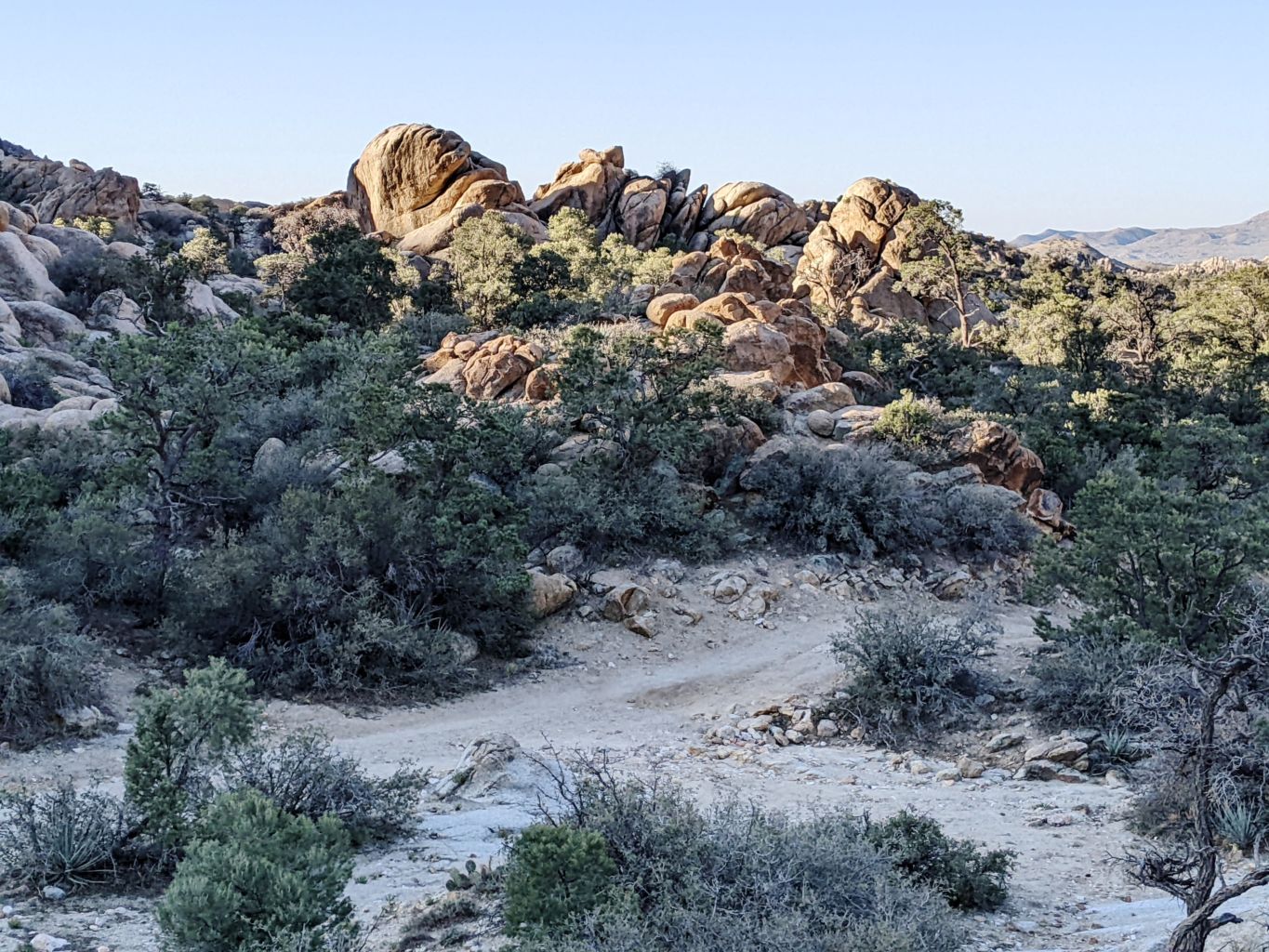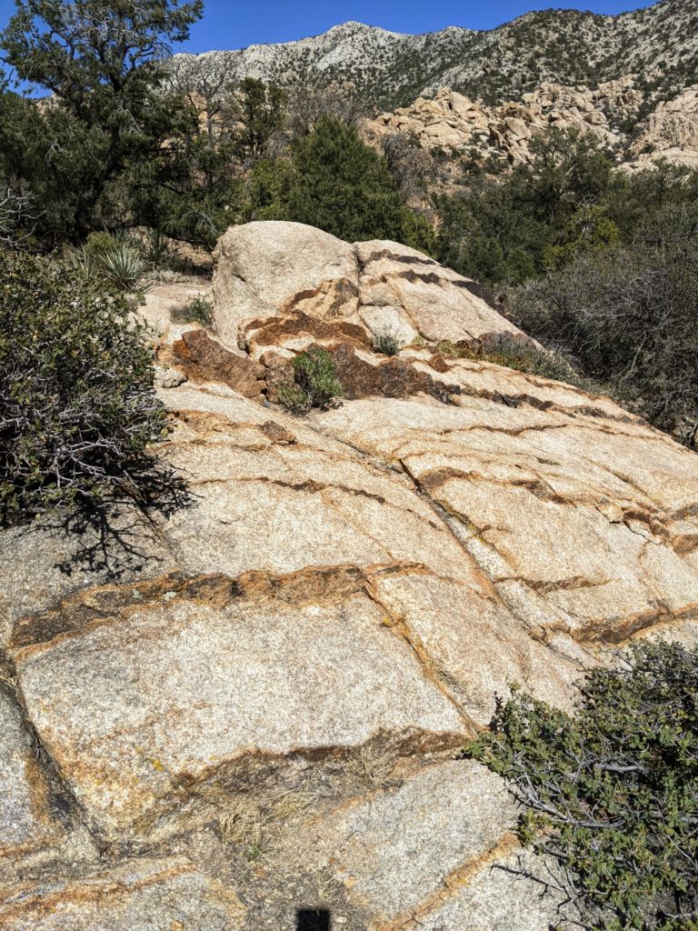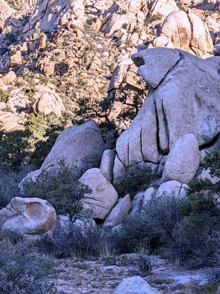 Nonetheless, prior to coming to those tracks, we came to another road without such signage so we decided to head up it and explore. It obviously had been used quite extensively as the road in was good and several spots had been trampled and cleared from use. We poked around here and there and finally settled in the shade of a massive boulder pile for some R and R. We were marveling at the great number of plant and brush species there were right in this little area, even though, at first glance, there wasn’t much growing at all. I should have pushed on and checked out those other roads as coming back is less and less likely. However, we again ran out of time and motivation and just headed back to camp.