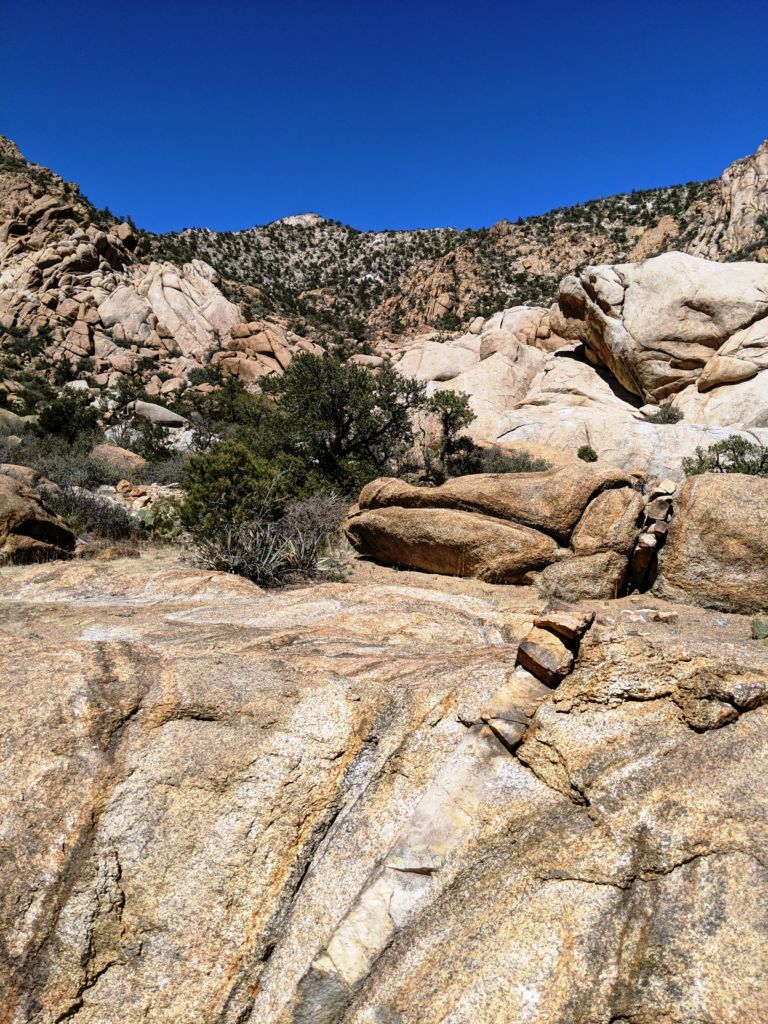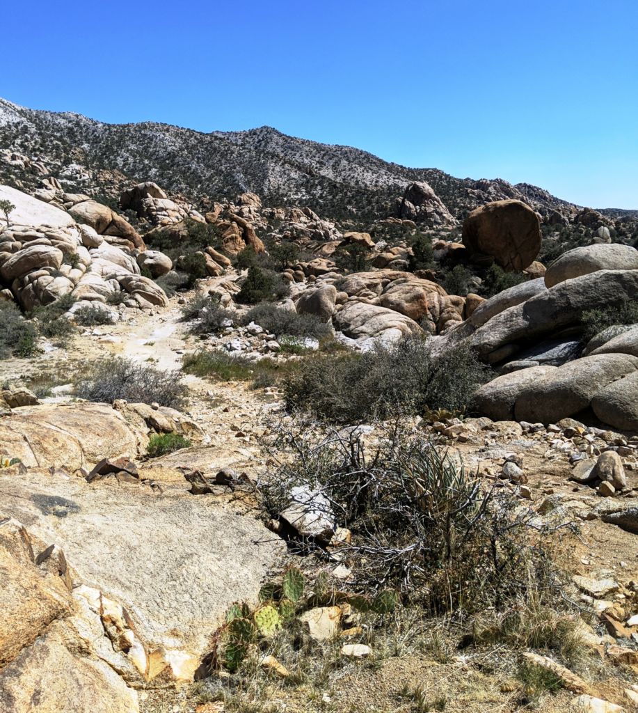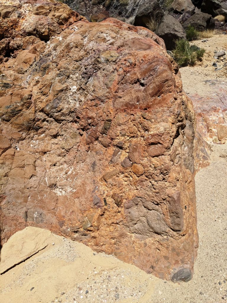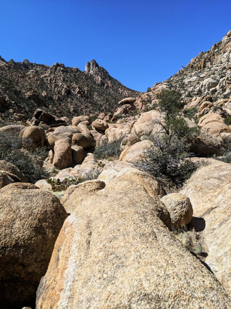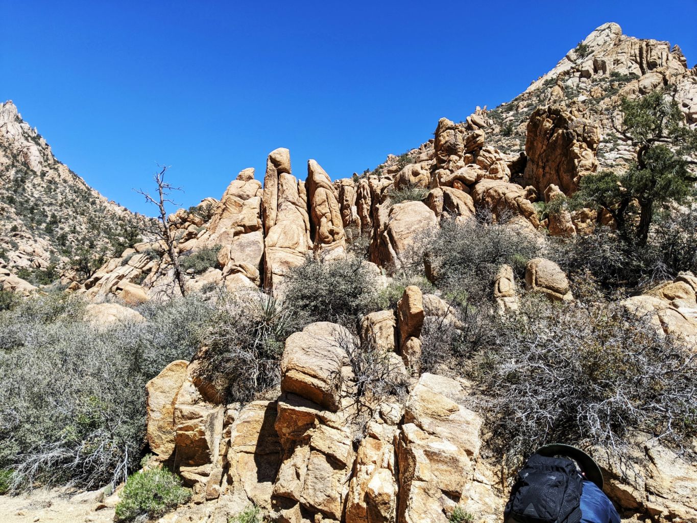 Nonetheless, prior to coming to those tracks, we came to another road without such signage so we decided to head up it and explore. It obviously had been used quite extensively as the road in was good and several spots had been trampled and cleared from use. We poked around here and there and finally settled in the shade of a massive boulder pile for some R and R. We were marveling at the great number of plant and brush species there were right in this little area, even though, at first glance, there wasn’t much growing at all. I should have pushed on and checked out those other roads as coming back is less and less likely. However, we again ran out of time and motivation and just headed back to camp.