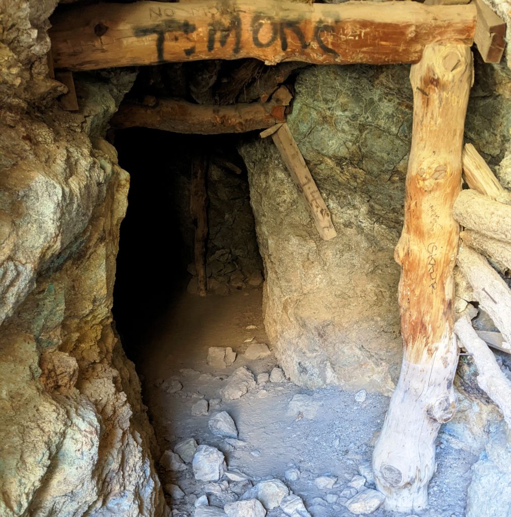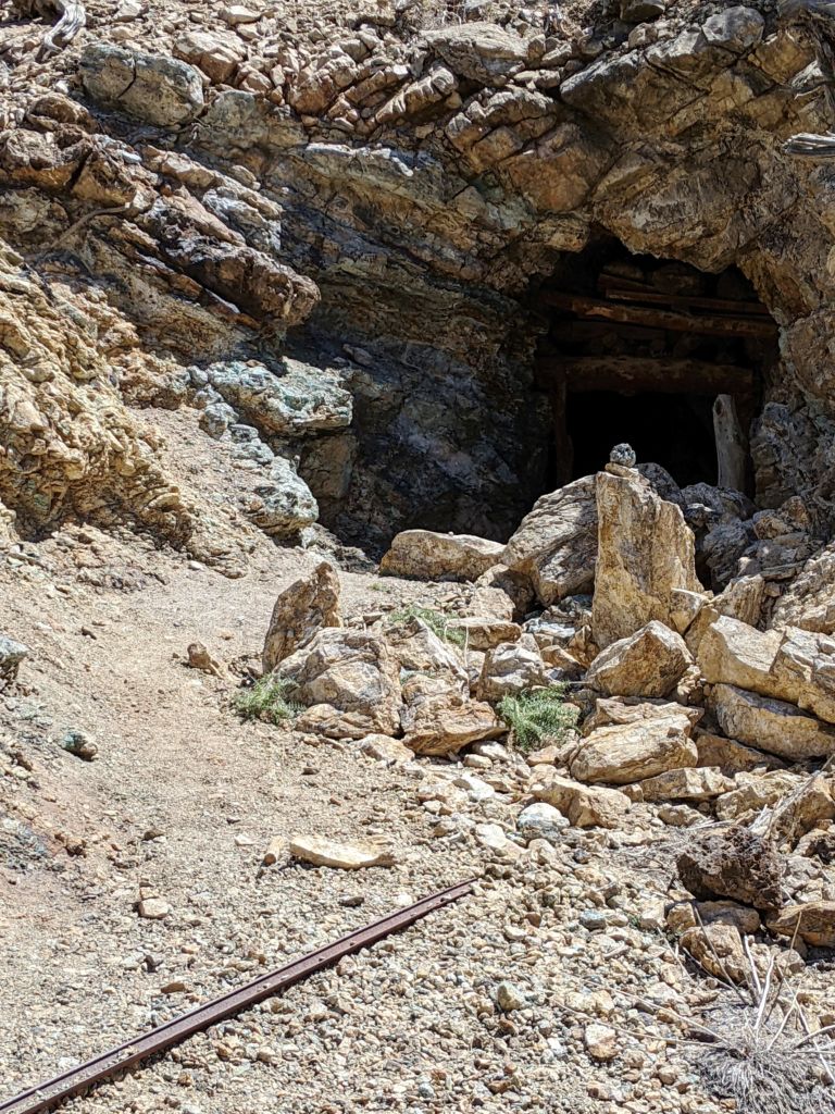 The road eventually became more of a narrow wagon trail. It clearly had been made for the mine, and perhaps even went up and over the ridge to the North, past the mine as more of a through road rather than just access to the mine. I was getting to the end of my hiking interest when Bob identified the little side trail up to the actual mine. Below the lip of the mine was covered in green shale-like rock and some of the wooden beams of the shoot and the massive bolts holding them together were still present. We poked around a bit and then retired in the shade for a celebratory beverage.