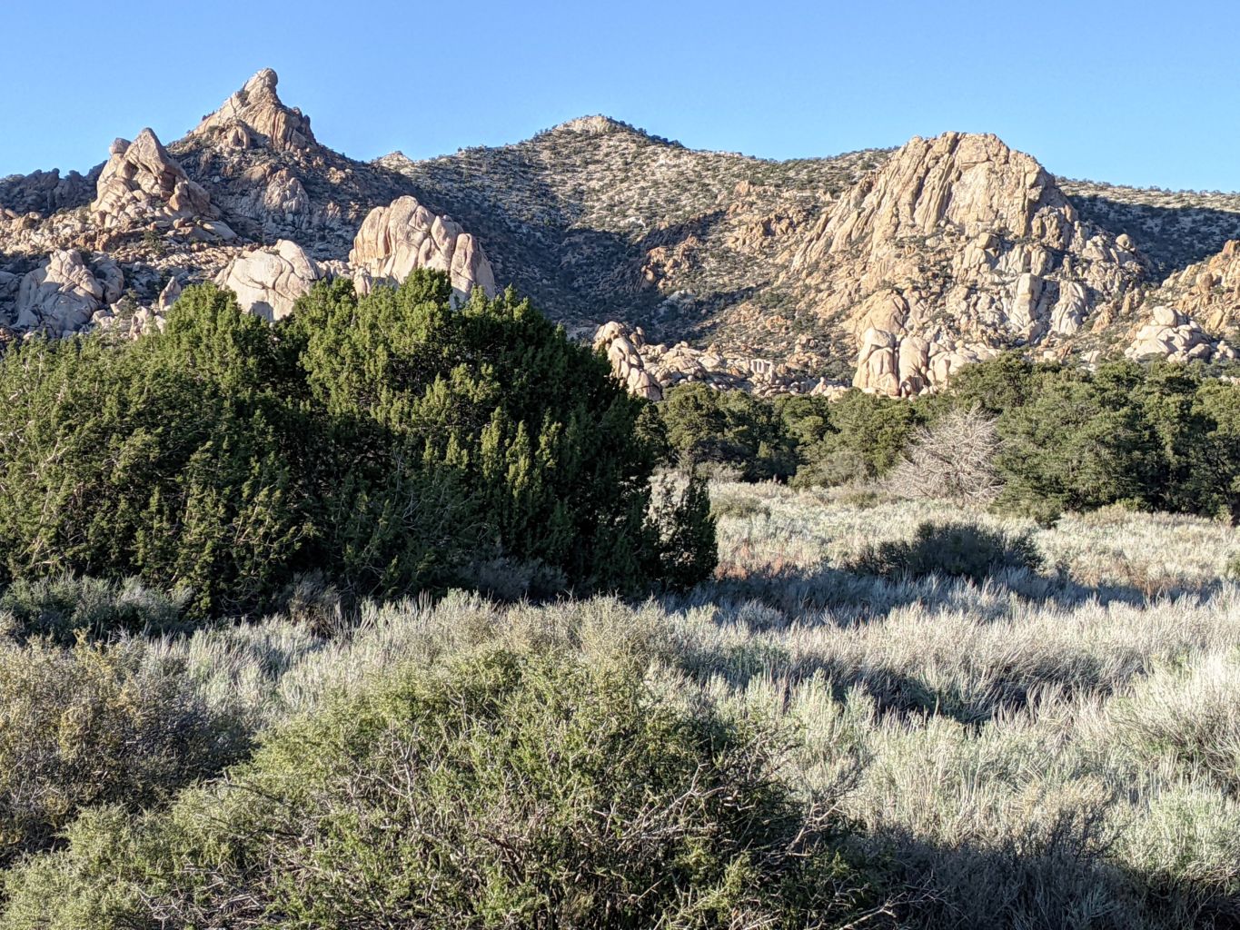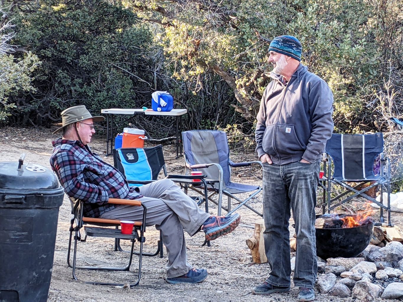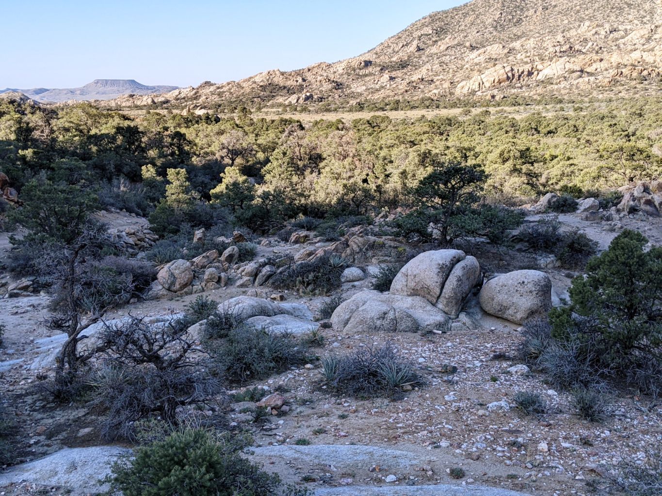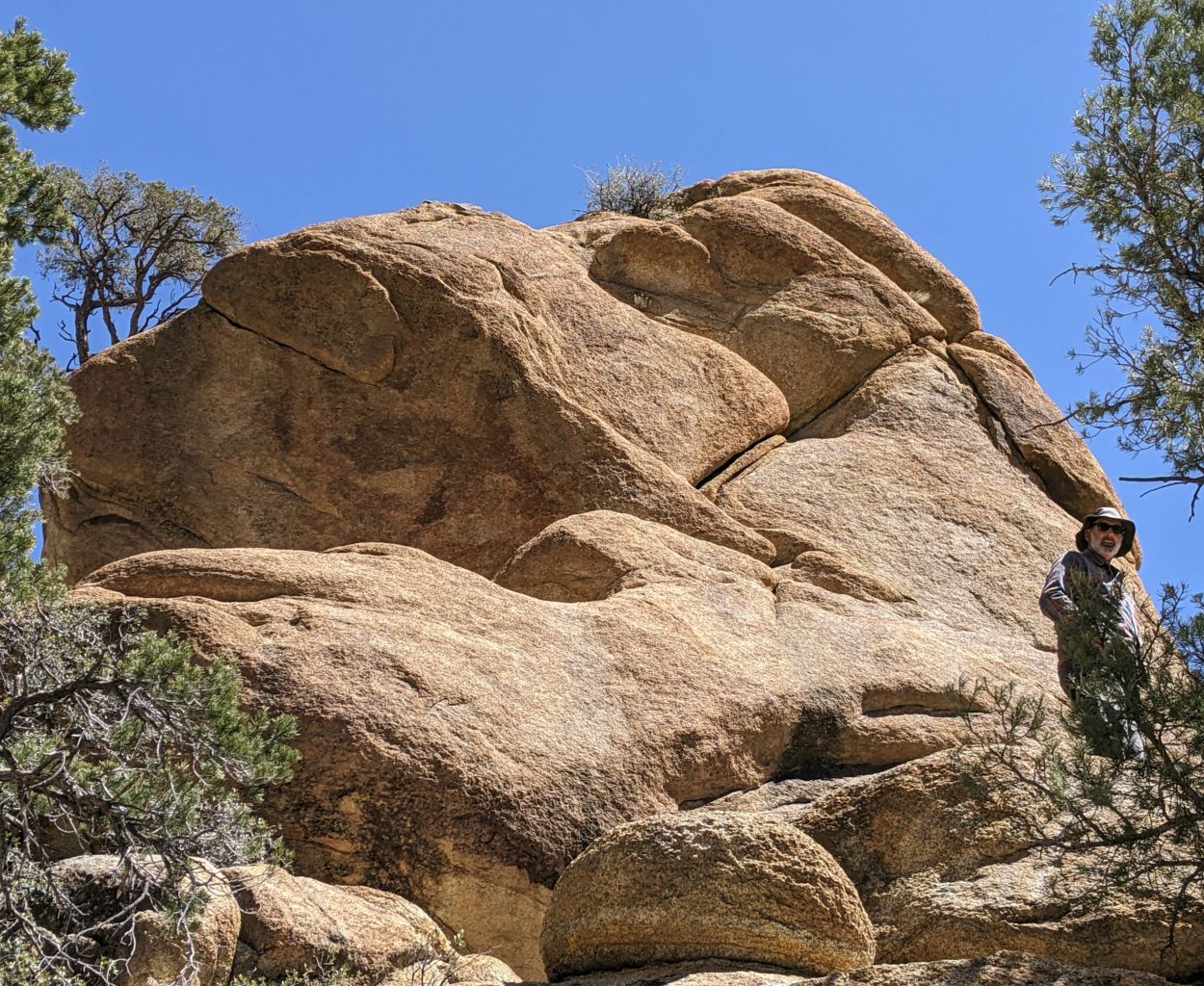 We got some grub and a beverage and sat in the shade reliving our hike. We dozed, and futzed with gear, and washed up, and nodded off, and read a bit. Eventually, it was grub time and Bob fixed up one of his tostada meals with all the fixins. It was wonderful. We had a nice little fire after the breeze died down even more. A gummy or 2 was distributed to ease the aches and pains and they must have invigorated the boys as we headed out of camp for a stroll up to the massive rocks that sort of marked the spot where the broad open savanna-like valley ended and the road dropped down into the thick Pinyon Pine forest we were camped in.