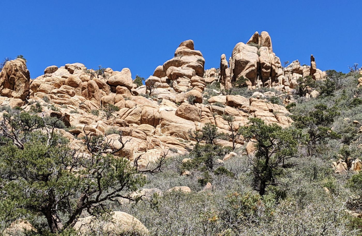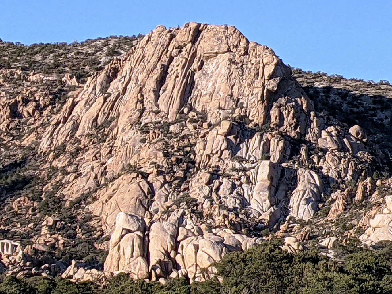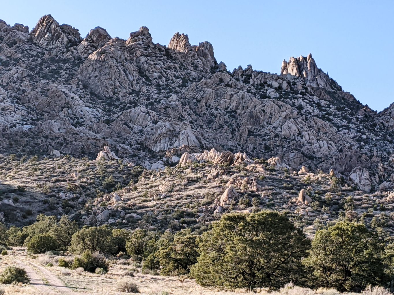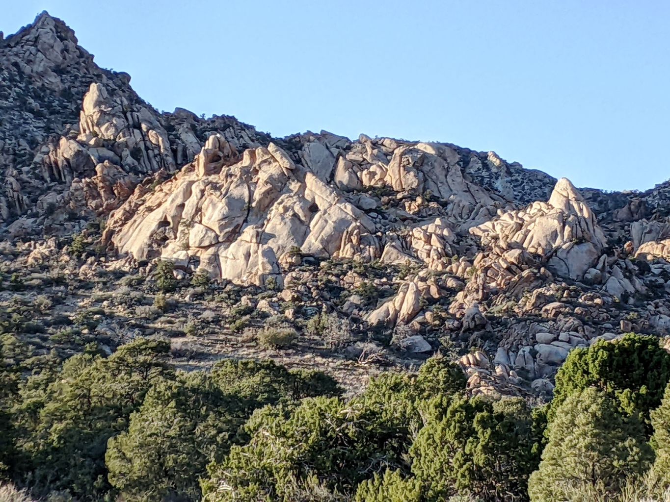 We got some grub and a beverage and sat in the shade reliving our hike. We dozed, and futzed with gear, and washed up, and nodded off, and read a bit. Eventually, it was grub time and Bob fixed up one of his tostada meals with all the fixins. It was wonderful. We had a nice little fire after the breeze died down even more. A gummy or 2 was distributed to ease the aches and pains and they must have invigorated the boys as we headed out of camp for a stroll up to the massive rocks that sort of marked the spot where the broad open savanna-like valley ended and the road dropped down into the thick Pinyon Pine forest we were camped in.