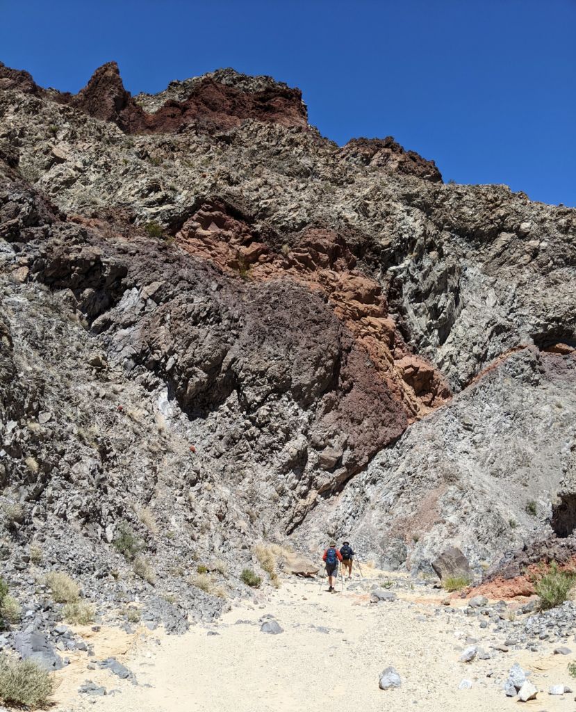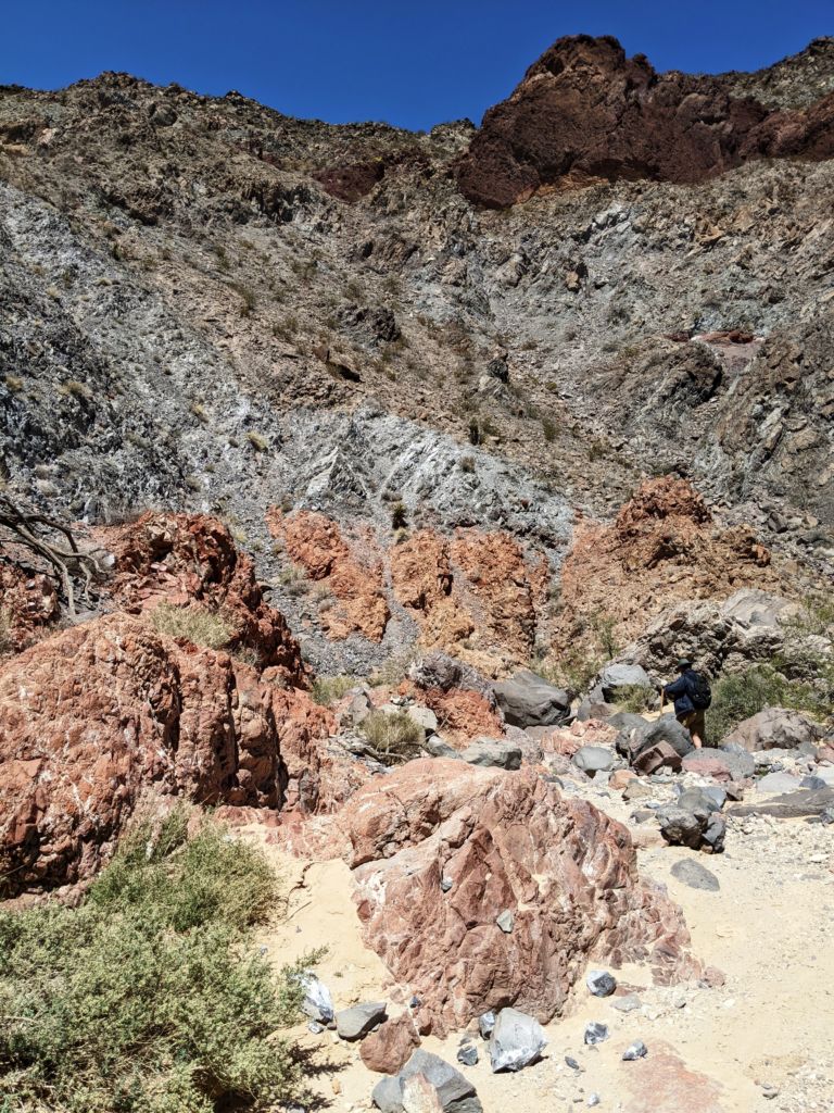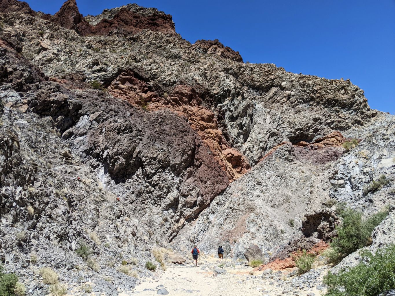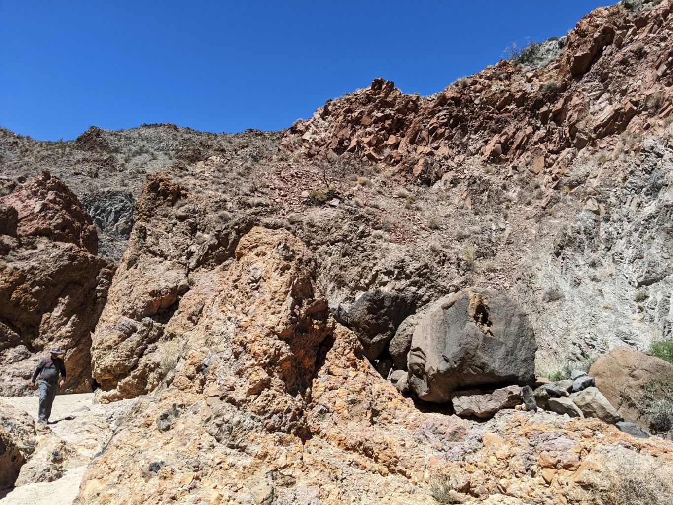 We had not gotten an early start, and it took several hours to get to this spot, the beginning of the hike that was to be the main adventure, and were estimating the hike could be several hours, and we didn’t have that time to get there, be there and get back before dark. But we were here now, and without too much discussion, over we went, and dropped steeply into the wide wash that quickly became a narrows twisting and turning like every drop of water and grain of sand that helped carve this tiny gap through the mountain range. The canyon was way more impressive than I had expected, which was nothing special. But it truly was spectacular in every way; colors, formations, flowers, birds, steepness, narrowness. It had everything except a little waterfall or even trickle of water, but still, it turned out to be a gorgeous place.
