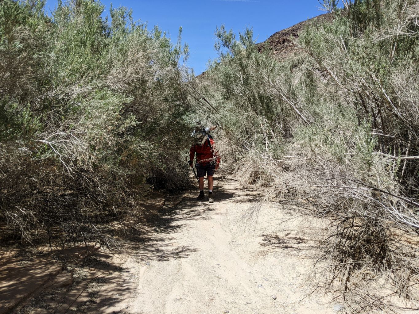We made pretty good time going downhill at a gentle slope, broken up by vertical drops where any precipitation would create awesome waterfalls. We did discuss the likelihood of being able to scramble back up the drops, but we chose to do them all. The twists and turns afforded ample shade in stretches as we moved in and out of alignment with the sun. The narrows were highly entertaining and we moved along pretty well. We had gone pretty far and time was definitely on our minds, when we came to a dense thicket of willow and poplar and mesquite. Progress slowed to a crawl as we navigated this swamp, literally sinking into the damp muck if we were not careful with our foot location.