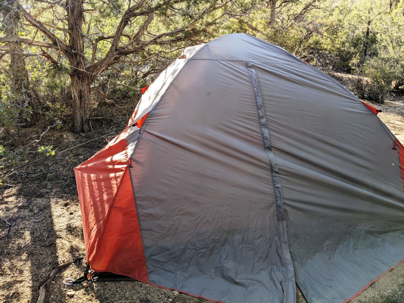 We soon had a good kitchen spot, but it took some time to find tent spots for each of us. We were all trying to figure out the wind, to no avail, so eventually settled for maximum protection on all sides. Tom and Bill positioned their rigs to add some level of protection, but we were getting the sense that this wind prediction was going to be more accurate that most weather forecasts. Everybody helped each other set up tents and roll out ground cloths. It was still sunny and warm despite the wind, so there didn’t seem to be a looming storm. It was probably near 7:00 when we finally had every single possible guy wire, tent stake, and rain fly support in place to hopefully withstand the gusts. I had used every piece of string, twine, and cord I had with me to lash the fly to the branches of the surrounding Pinyon. I was up a little trail into the dense trees, so I felt pretty good about my fate.