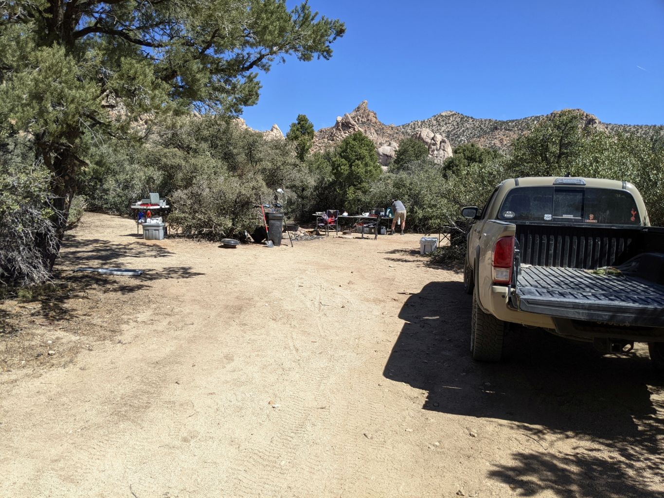 We dropped into a ravine and crawled back out and into a very large and dense Pinyon forest. The pines gave shelter to a lot of underbrush, so the grove was very well protected. There were camp sites all over the place, plenty of tent sites and flat ground, and although the wind was still blasting, this was as much cover as we could hope for. We were giddy at coming to the end of the long days drive and anxious to tell Bob and Bill. Meeting back up, they had not found much for potential sites so it was an easy decision to bring them back into our spot. They were much pleased. We pulled our rigs into the farthest spots and began to unload.