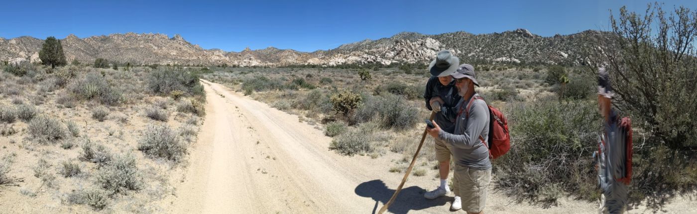 He was a little gruff at first, but after I told them we were after a beverage, he eased up, and told me a lot about town and himself and his travels, but no liquid refreshments were provided. After a good talk, I returned to Bob and Tom and we settled for drinking our own beers. After a good rest, we headed back to the intersection to meet Bill who had spent some time in the Costco gas line in Bakersfield on the way down??? Once united, we headed South down Ivanpah Road, crossed the railroad tracks, passed through the narrow gap at the edge of the New York’s and continued on South looking for the New York Mountain Road at the intersection of a large, long abandoned ranch.