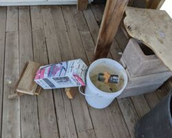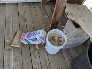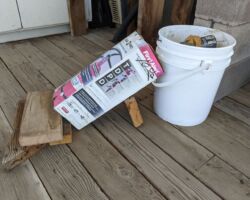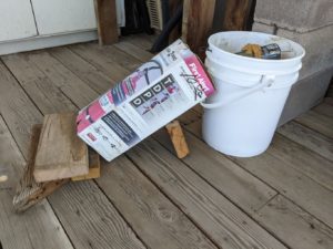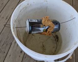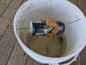 To help ease my pain by bringing some to others, I decided I would set up our first attempt to eradicate the mousies. Mike and I had been talking for a while about how to get rid of the mice. We didn’t want to do poison or try anything that might catch/injure anybody else, like the snake or fox or birdies or lizzies. Mike eventually told me about a YouTube video (where else do people get information these days) where the guy filled a 5 gallon bucket about half way with water, and strung a beer can across the top on a wire with peanut butter on it. Apparently, the mousy goes out on the beer can to get the peanut butter and because he/she/they are not proficient at log rolling, they spin off the can into the drink and drown.