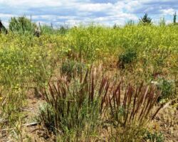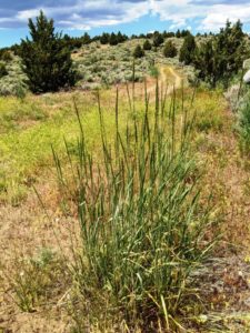 This time, there was both a white plastic tube and another T post. It was severely bent, most likely run over by a tractor, giving it about a 45 degree bend to the upper third of the metal post. Again, I was able to use the wooden stakes jammed up inside the tube to make a sleeve holding the T posts on top of each other. I used the baling wire to wire it all tightly together and sprayed the hell out of the top of the T post that was now about 7 feet tall and bright yellow. My concern that the yellow might blend in with the drying grass was allayed when I got back to the road with Mike and looked out into the field.