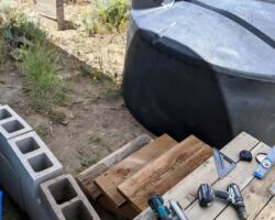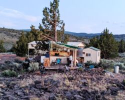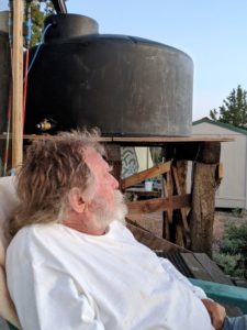 The morning was warm already, so we hung on the Western addition in the shade. I didn’t have a ton of energy but I wanted to get going before it got too hot. I gave Mike the job of figuring out the mounting bracket for the solar panel and left him in the kitchen to work on that. I went out to dig out the poopy hole for the RV. I had left the railroad ties I wanted to use as the base for the poopy pit cover. Thankfully my chainsaw fired up and I easily cut them to length. However, every time I climber down the ladder into the pit, all this loose material followed me in, so I spent a considerable time just shoveling out the pit.