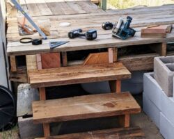 I got back out the tools I needed and saw the stair treads and stringers I had brought over on previous trips. I was ready to rock. I reluctantly cut off the top step from the stringer to make it a 3 stepper instead of 4, as I had not built steps on my own before, but it turned out to be the right move. I made a custom notch in it and made the same cuts to the other stringer. They attached to the deck well and I added an excess of additional blocking to them. The stair tread cuts and attaching went easily. I was one tread short, so I hiked out to Bob’s cabin site and pilfered an old weathered board I thought was Douglas Fir like the rest of the deck and material we had been using, but it turned out to be a nice piece of old Redwood. This last board of the project being a little different amused me.