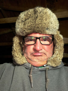 The wind stopped as suddenly as it started and it was near total calm at 6:30. I again was plenty full from lunch so I drank my calories, had a little fire in the corral. I was early to bed, but not early to rise. The overnight low was 24 and the cabin felt like a meat locker. Knowing I eventually had to get up, I covered myself in many layers of clothing, my super warm hat with lowered ear flaps, and my gloves and ventured outside. Everything was white with frost. The tiny flecks of frozen crystals sparkled in the low sunlight. It really was beautiful…and cold. I again had my first cup up on the upper terrace but I had to sit on the ground as all the chairs were frosted.