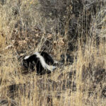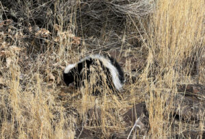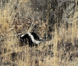 When I was fishing the rat out of the tank, I noticed one of the glass panels of the shower stall was loose and so I went about securing it. While I was over there, I saw the skunk just a few feet away gnawing on a rat carcass. He was there for several hours just working this thing over, hopefully getting a good meal from it. While I was setting up my new water tank at my cabin, I saw the skunk heading down the road towards Bob’s cabin. He had a terrible limp and could only move about 10’ at a time before he would just crumple down in the road and rest a minute or two before making another short advance on his destination. It was really sad to see him in such bad shape.