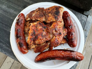 Since I kind of was prepared to work full days and not knock off early to clean up, get a shower, cook and eat before it was dark at about 6:30 these days, I wanted to cook all my food tonight so it would be ready to simply heat up or even eat cold. I was happy to have so much time to enjoy the fire and a cocktail and ease into my first evening on such a great day. I BBQ’d chicken and sausages, baked the stuffed mushrooms, and easily erased a half round of shrimps I warmed on the fire. It was a delicious dinner and I saved all the meat for other meals.