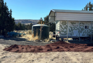 With that he spread his load on down the road and went back to the pavement to get his other transfer. He drove all the way up top without incident and happily got out of his truck to check out the buildings and the view. We walked out to the lounge and chatted for a few minutes. We gave him a $50 tip for being so amenable and reasonable. He maneuvered his rig as best he could do drop the material between Mike’s trailer, my cabin, and the kitchen but it was tough to actually spread it in the nooks and crannies. He apologized for not being able to do better but we were super happy he got it up here and spread as much as it was. With that he was off and Mike and I had a minute to survey the impact. It was glorious.
