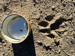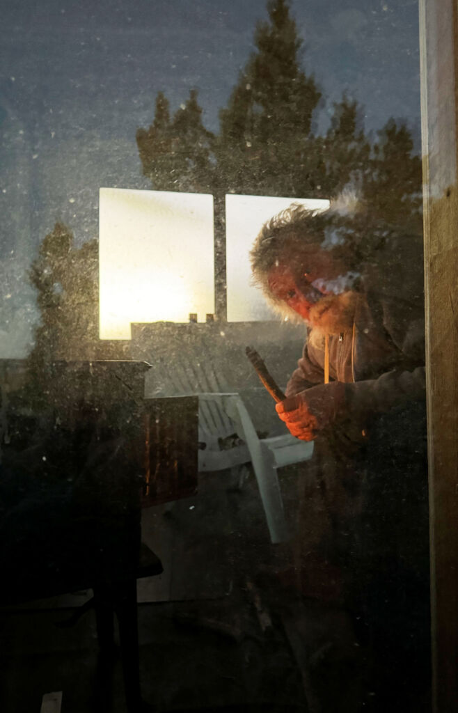 With that, it was time to really get after prepping to leave. Mike worked on the trailer while I cut up the last of the 15’ lengths of siding and brought a load of lumber down to the wood pile and covered it all with the huge billboard tarp. I fed the kitty skunk and grabbed the 2 roofing panels I wanted to bring home. I gathered pretty much everything I wanted to bring home around my cabin and the trailer, took pictures of the wolf tracks, and then got ready for our final cocktails of the year. I called Mike to come so we could have a long leisurely afternoon, but I was already done with my drink out on the upper terrace before he arrived as his 5 minutes is always 30.