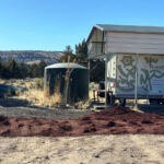 You always wish the rock covered a little more but we were in pretty good shape, got the material up top which was in question for a minute, and the red color was fantastic. It really was beautiful and contrast with the yellow grass. It really reminded me of traveling highways 89, 44, and 36 as a kid with mom and dad. Going to Lassen National Park and Burney Falls. I remember the roads being bright red and it setting off the dark green of the pines tightly packed on either side of the road. It was very cool to again have pulled off a late season unexpected rock job and to have that childhood memory on the Hill. Now we waited for the return of the bitch with the last load. We had lunch and looked at the material that had been dumped. Mike couldn’t help but grab a rake and start moving it around. I grabbed a few more things that needed to come home with us, checked out the Yellowstone, organized some things, sprayed some leak stopping stuff on the water tanks, took down some ladders, put in the plug for the new water tank from Kelly, put some bleach in the rat water of the kitchen tank, and then we heard the beeping of the gravel truck.