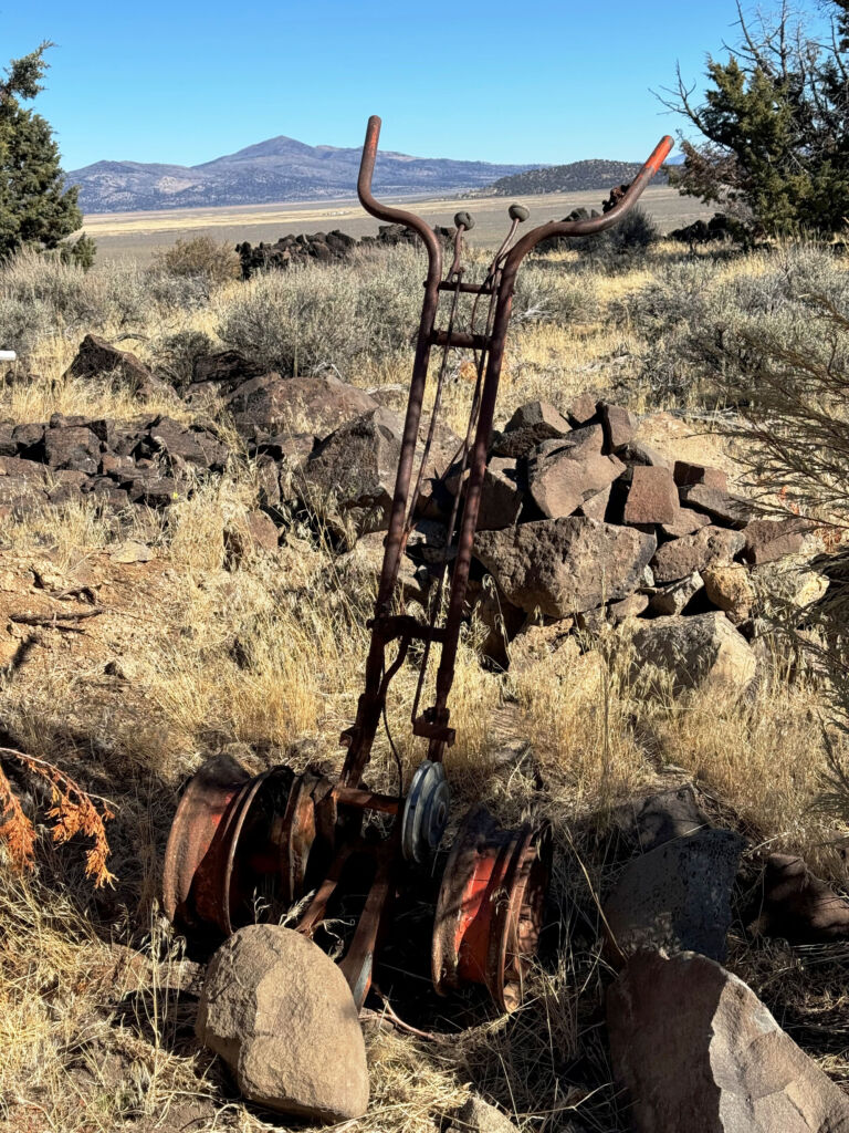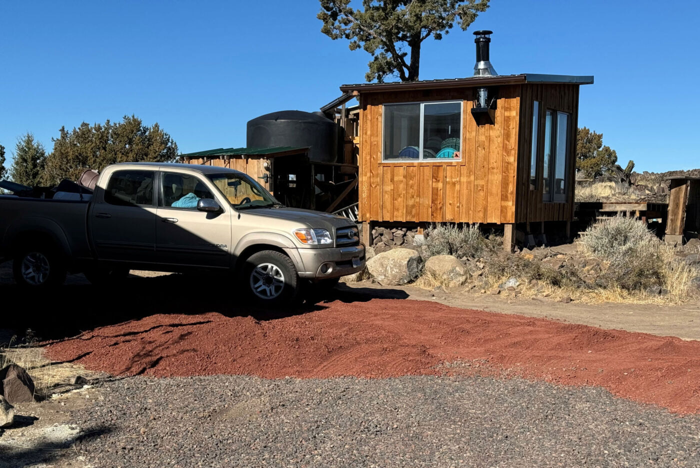 You always wish the rock covered a little more but we were in pretty good shape, got the material up top which was in question for a minute, and the red color was fantastic. It really was beautiful and contrast with the yellow grass. It really reminded me of traveling highways 89, 44, and 36 as a kid with mom and dad. Going to Lassen National Park and Burney Falls. I remember the roads being bright red and it setting off the dark green of the pines tightly packed on either side of the road. It was very cool to again have pulled off a late season unexpected rock job and to have that childhood memory on the Hill. Now we waited for the return of the bitch with the last load. We had lunch and looked at the material that had been dumped. Mike couldn’t help but grab a rake and start moving it around. I grabbed a few more things that needed to come home with us, checked out the Yellowstone, organized some things, sprayed some leak stopping stuff on the water tanks, took down some ladders, put in the plug for the new water tank from Kelly, put some bleach in the rat water of the kitchen tank, and then we heard the beeping of the gravel truck.