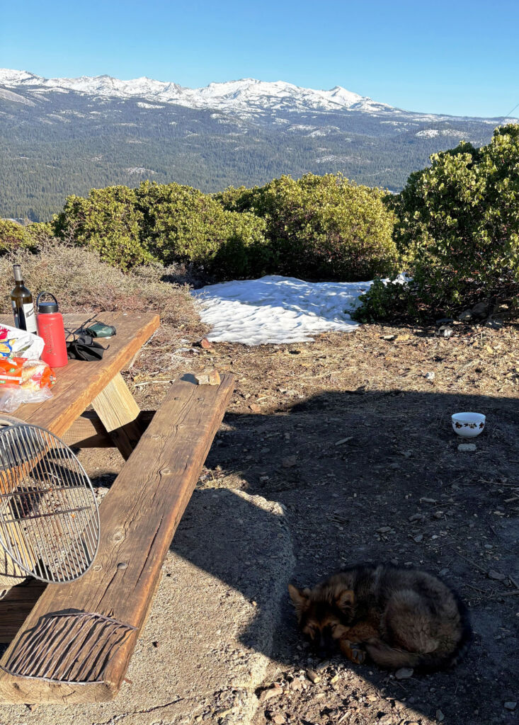 In late January Ken, Steve, and I headed up to Big Hill Lookout, a great place to view the Crystal Range and/or play in the snow as even though it is over 6100’ elevation, the forest service and/or PG&E keep the road plowed. We have had a really good snow year so it was fantastic to get up to see it, especially on such a beautiful day. This is a spot we have come to over the years for great day trips and for a few camp trips. We did not see or hear another person all day except for when we walked out to the observation deck. Puppy was super good, even though he was super young at the time.